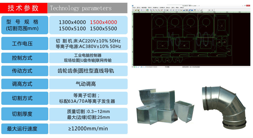 特別針對通風管道行業(yè)專門用于切割2mm以下的薄、中碳鋼板、 不銹鋼板、鋁板、銅板、鍍鋅板、白鐵皮、合金板等多種板材材料,快速風管等離子切割機,效果佳、無掛渣和毛刺;在使用時直接連接普通配置的臺式電腦,運用文泰軟件或AutoCAD繪圖軟件直接用于繪制圖形,不需轉換,直接切割,并可進行簡單的排料,工件共邊設置,購買本公司此款設備可享受免費送貨上門、安裝調試及培訓、包教包會!